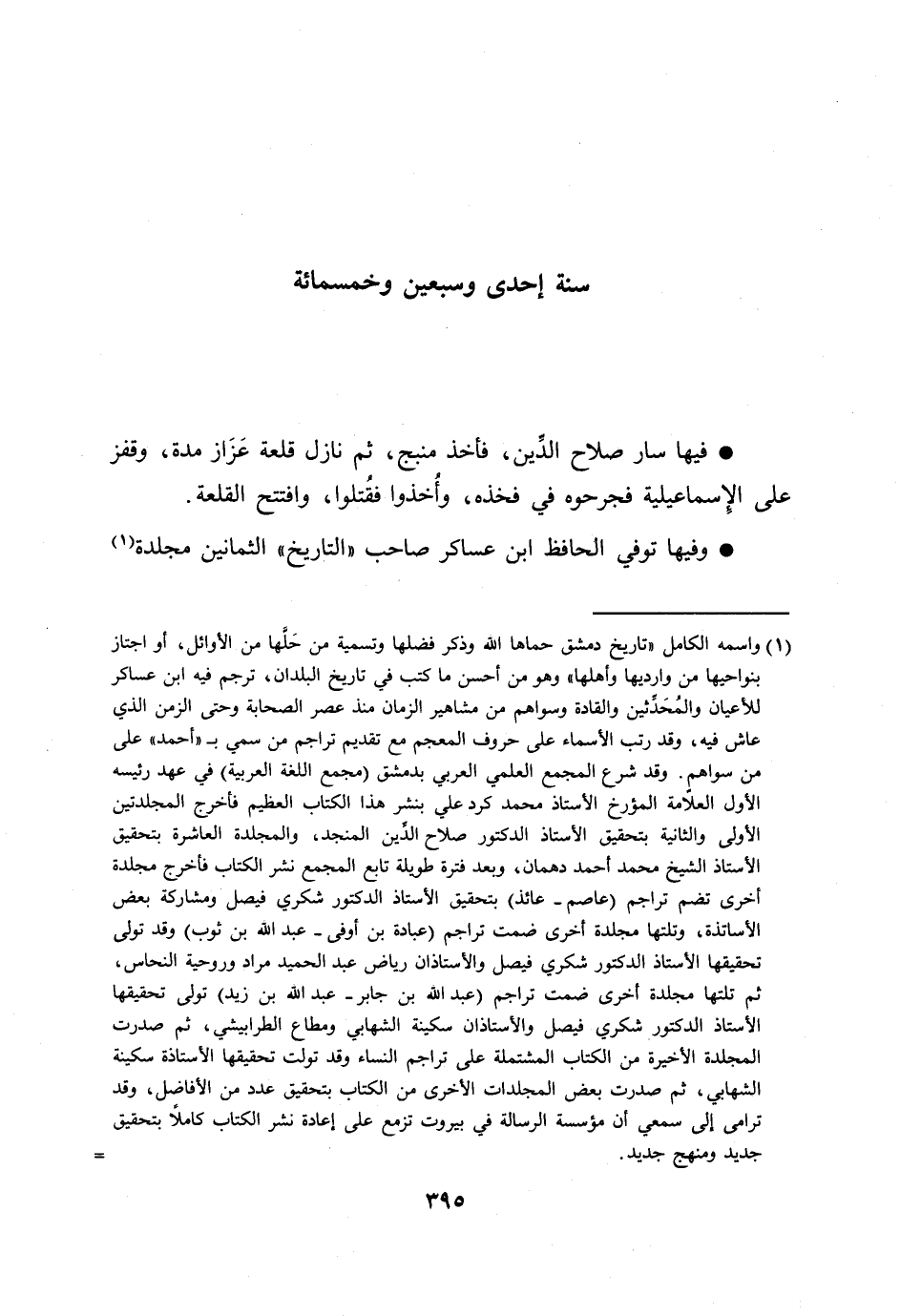 [1] واسمه الكامل «تاريخ دمشق حماها الله وذكر فضلها وتسمية من حلّها من الأوائل، أو اجتاز بنواحيها من وارديها وأهلها» وهو من أحسن ما كتب في تاريخ البلدان، ترجم فيه ابن عساكر للأعيان والمحدّثين والقادة وسواهم من مشاهير الزمان منذ عصر الصحابة وحتى الزمن الذي عاش فيه، وقد رتب الأسماء على حروف المعجم مع تقديم تراجم من سمي ب «أحمد» على من سواهم. وقد شرع المجمع العلمي العربي بدمشق (مجمع اللغة العربية) في عهد رئيسه الأول العلّامة المؤرخ الأستاذ محمد كرد علي بنشر هذا الكتاب العظيم فأخرج المجلدتين الأولى والثانية بتحقيق الأستاذ الدكتور صلاح الدّين المنجد، والمجلدة العاشرة بتحقيق الأستاذ الشيخ محمد أحمد دهمان، وبعد فترة طويلة تابع المجمع نشر الكتاب فأخرج مجلدة أخرى تضم تراجم (عاصم- عائذ) بتحقيق الأستاذ الدكتور شكري فيصل ومشاركة بعض الأساتذة، وتلتها مجلدة أخرى ضمت تراجم (عبادة بن أوفى- عبد الله بن ثوب) وقد تولى تحقيقها الأستاذ الدكتور شكري فيصل والأستاذان رياض عبد الحميد مراد وروحية النحاس، ثم تلتها مجلدة أخرى ضمت تراجم (عبد الله بن جابر- عبد الله بن زيد) تولى تحقيقها الأستاذ الدكتور شكري فيصل والأستاذان سكينة الشهابي ومطاع الطرابيشي، ثم صدرت المجلدة الأخيرة من الكتاب المشتملة على تراجم النساء وقد تولت تحقيقها الأستاذة سكينة الشهابي، ثم صدرت بعض المجلدات الأخرى من الكتاب بتحقيق عدد من الأفاضل، وقد ترامى إلى سمعي أن مؤسسة الرسالة في بيروت تزمع على إعادة نشر الكتاب كاملا بتحقيق جديد ومنهج جديد.