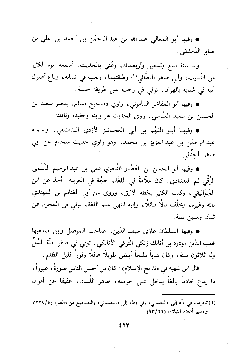 وفيها أبو الفهم بن أبي العجائز الأزدي الدمشقي، واسمه عبد الرحمن بن عبد العزيز بن محمد، وهو راوي حديث سحنام عن أبي طاهر الحنّائي.