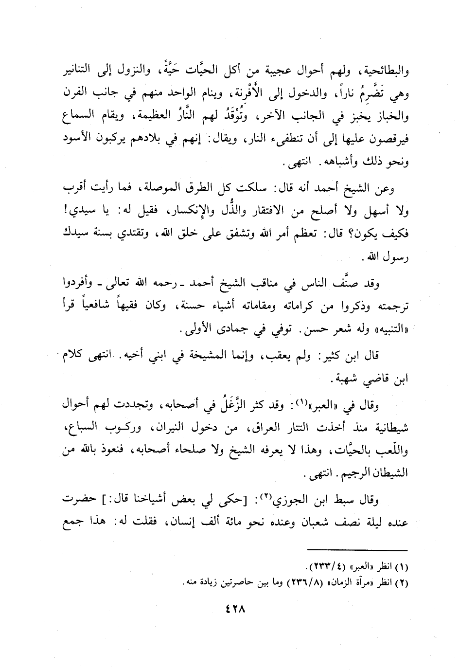 وقال في «العبر» [1] : وقد كثر الزّغل في أصحابه، وتجددت لهم أحوال شيطانية منذ أخذت التتار العراق، من دخول النيران، وركوب السباع، واللّعب بالحيّات، وهذا لا يعرفه الشيخ ولا صلحاء أصحابه، فنعوذ بالله من الشيطان الرجيم. انتهى.