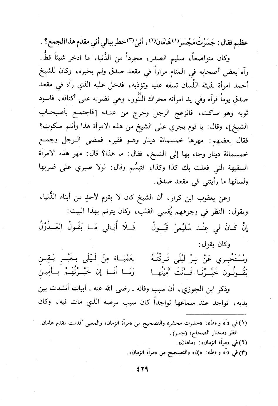 فقال بعضهم: مهرها خمسمائة دينار وهو فقير، فمضى الرجل وجمع خمسمائة دينار وجاء بها إلى الشيخ، فقال: ما هذا؟ قال: مهر هذه الامرأة السفيهة التي فعلت بك كذا وكذا، فتبسّم وقال: لولا صبري على ضربها ولسانها ما رأيتني في مقعد صدق.