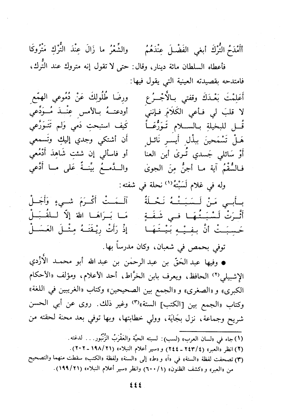 [3] تصحفت لفظة «الستة» في «آ» و «ط» إلى «السنة» ولفظة «الكتب» سقطت منهما والتصحيح من «العبر» و «كشف الظنون» (1/ 600) وانظر «سير أعلام النبلاء» (21/ 199) .