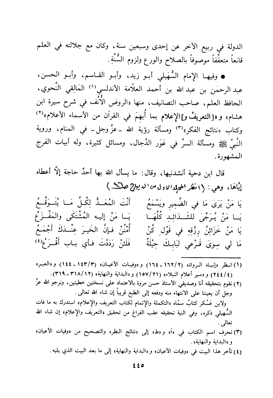 وفيها الإمام السّهيلي أبو زيد، وأبو القاسم، وأبو الحسن، عبد الرحمن بن عبد الله بن أحمد العلّامة الأندلسي [1] المالقي النّحوي، الحافظ العلم، صاحب التصانيف، منها «الروض الأنف في شرح سيرة ابن هشام» و « [التعريف و] الإعلام بما أبهم في القرآن من الأسماء الأعلام» [2] وكتاب «نتائج الفكر» [3] ومسألة رؤية الله- عزّ وجل- في المنام، وروية النّبيّ صلى الله عليه وسلم ومسألة السرّ في عور الدّجال، ومسائل كثيرة، وله أبيات الفرج المشهورة.