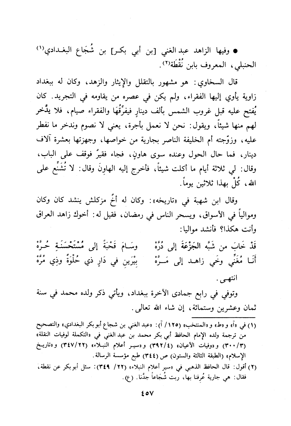 وفيها الزاهد عبد الغني [بن أبي بكر] بن شجاع البغدادي [1] الحنبلي، المعروف بابن نقطة [2] .