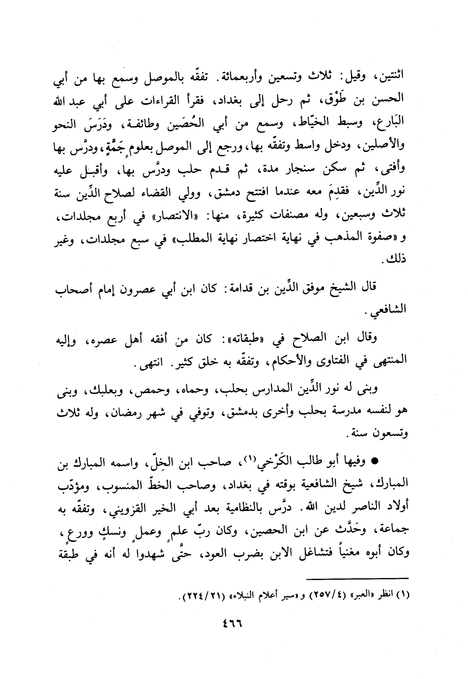 اثنتين، وقيل: ثلاث وتسعين وأربعمائة. تفقّه بالموصل وسمع بها من أبي الحسن بن طوق، ثم رحل إلى بغداد، فقرأ القراءات على أبي عبد الله البارع، وسبط الخيّاط، وسمع من أبي الحصين وطائفة، ودرس النحو والأصلين، ودخل واسط وتفقّه بها، ورجع إلى الموصل بعلوم جمّة، ودرّس بها وأفتى، ثم سكن سنجار مدة، ثم قدم حلب ودرّس بها، وأقبل عليه نور الدّين، فقدم معه عند ما افتتح دمشق، وولي القضاء لصلاح الدّين سنة ثلاث وسبعين، وله مصنفات كثيرة، منها: «الانتصار» في أربع مجلدات، و «صفوة المذهب في نهاية اختصار نهاية المطلب» في سبع مجلدات، وغير ذلك.
