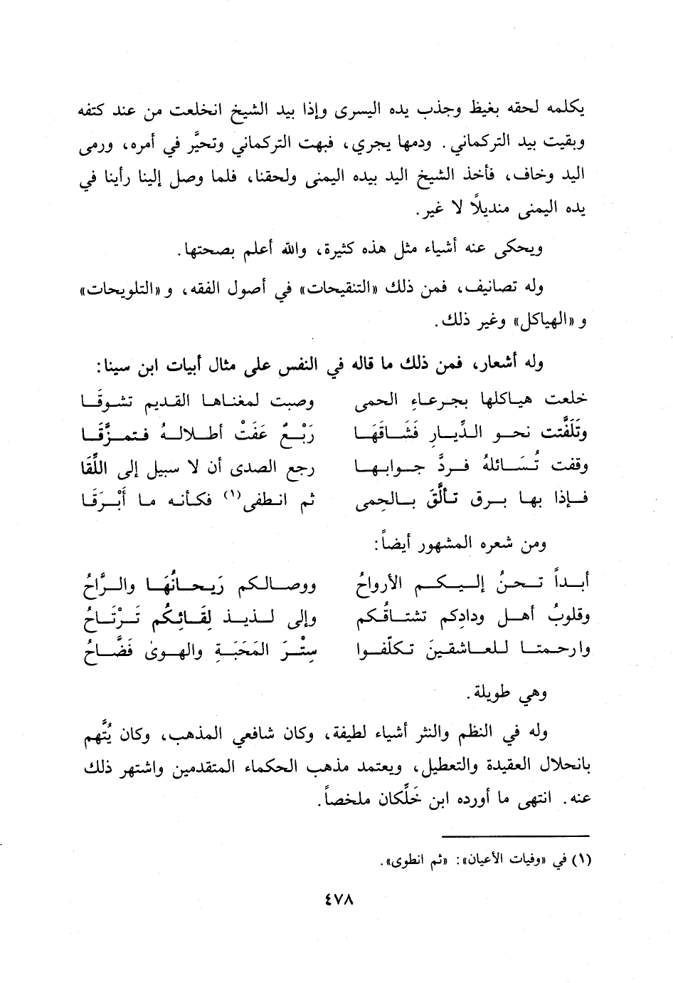 وله في النظم والنثر أشياء لطيفة، وكان شافعي المذهب، وكان يتّهم بانحلال العقيدة والتعطيل، ويعتمد مذهب الحكماء المتقدمين واشتهر ذلك عنه. انتهى ما أورده ابن خلّكان ملخصا.