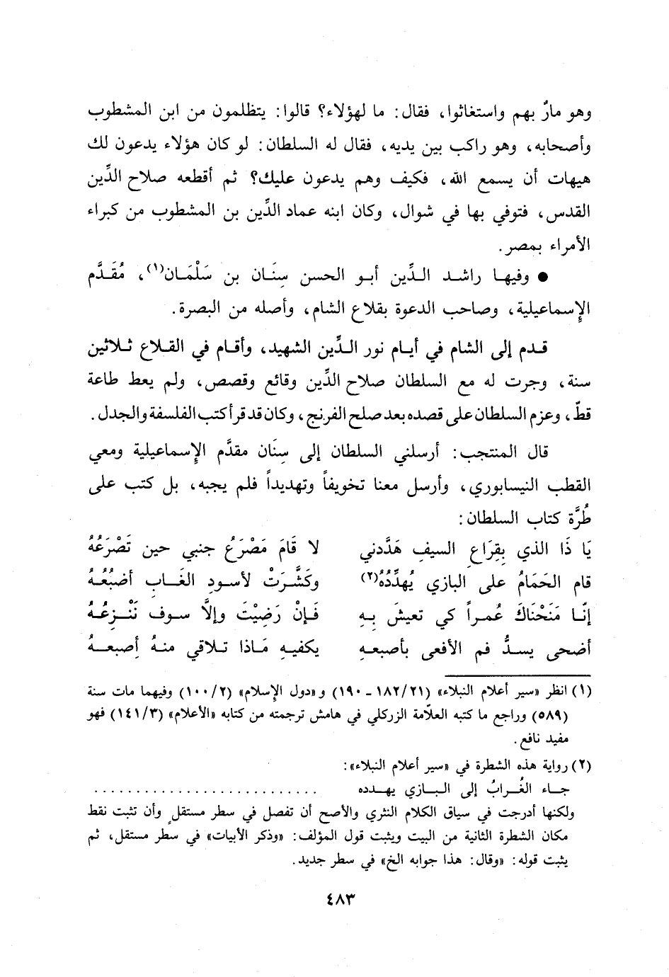 قال المنتجب: أرسلني السلطان إلى سنان مقدّم الإسماعيلية ومعي القطب النيسابوري، وأرسل معنا تخويفا وتهديدا فلم يجبه، بل كتب على طرّة كتاب السلطان: