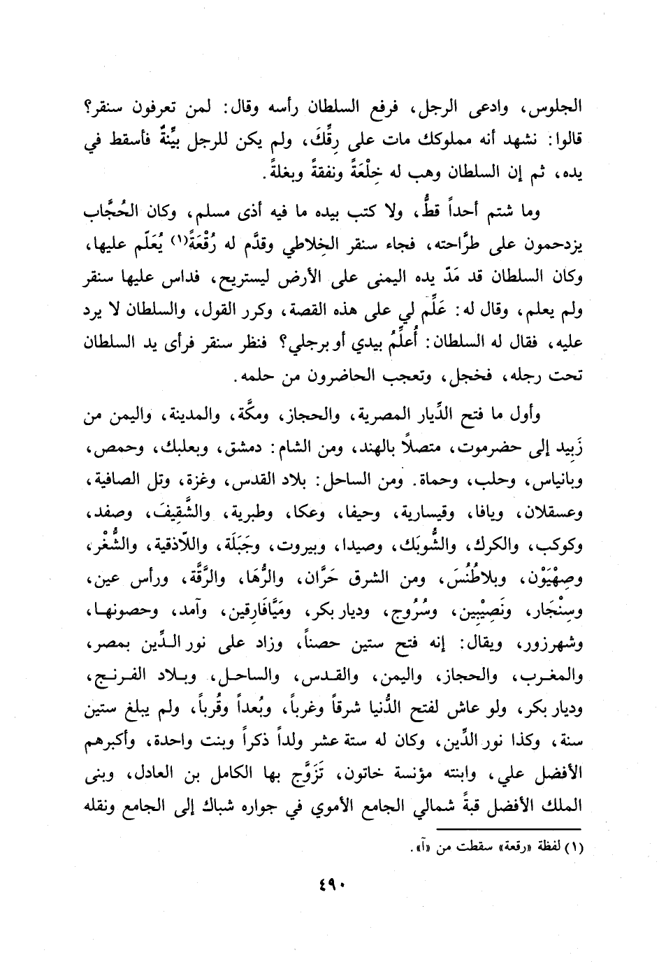 وما شتم أحدا قطّ، ولا كتب بيده ما فيه أذى مسلم، وكان الحجّاب يزدحمون على طرّاحته، فجاء سنقر الخلاطي وقدّم له رقعة [1] يعلّم عليها، وكان السلطان قد مدّ يده اليمنى على الأرض ليستريح، فداس عليها سنقر ولم يعلم، وقال له: علّم لي على هذه القصة، وكرر القول، والسلطان لا يرد عليه، فقال له السلطان: أعلّم بيدي أو برجلي؟ فنظر سنقر فرأى يد السلطان تحت رجله، فخجل، وتعجب الحاضرون من حلمه.