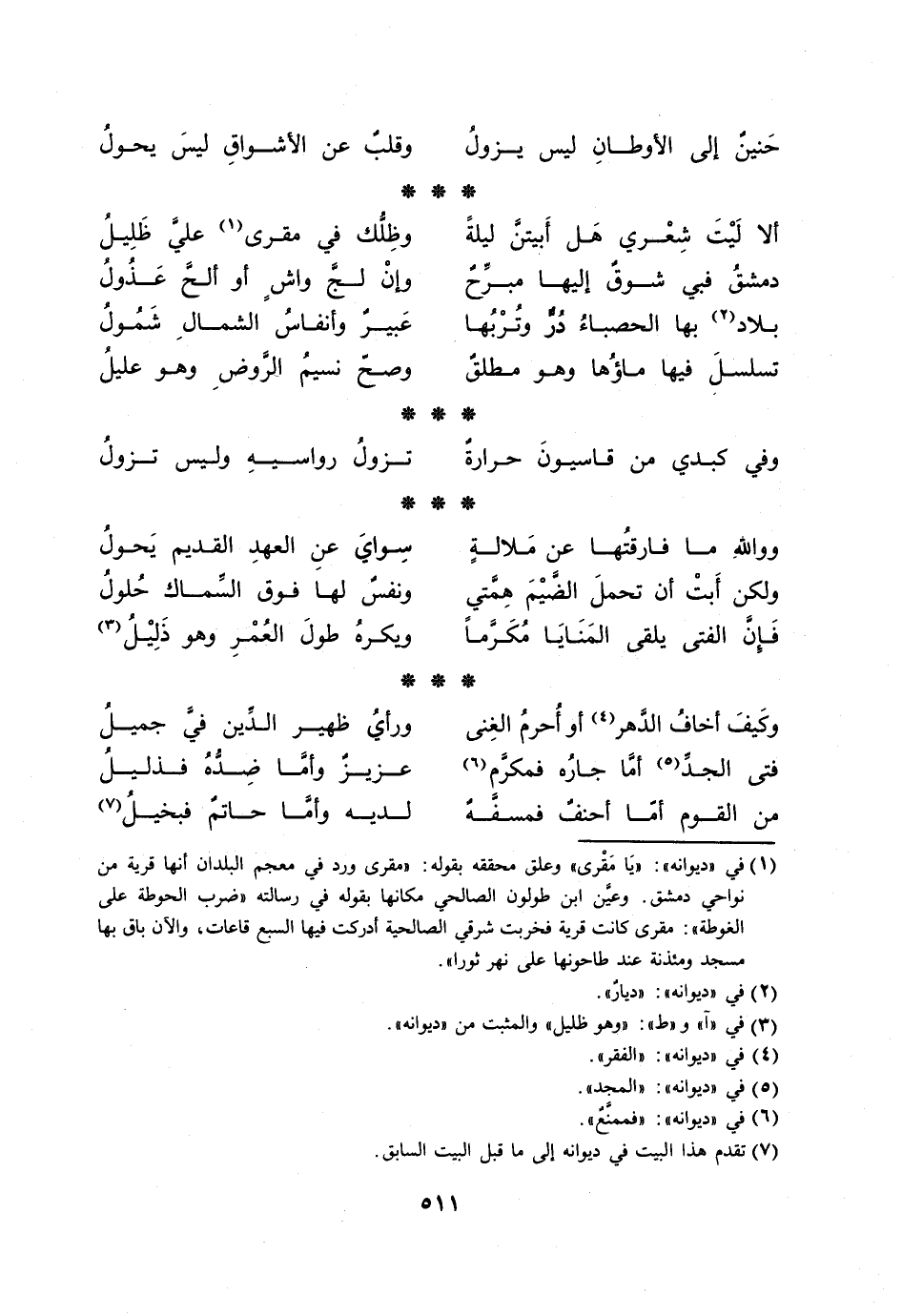 [1] في «ديوانه» : «يا مقرى» وعلق محققه بقوله: «مقرى ورد في معجم البلدان أنها قرية من نواحي دمشق. وعيّن ابن طولون الصالحي مكانها بقوله في رسالته «ضرب الحوطة على الغوطة» : مقرى كانت قرية فخربت شرقي الصالحية أدركت فيها السبع قاعات، والآن باق بها مسجد ومئذنة عند طاحونها على نهر ثورا» .