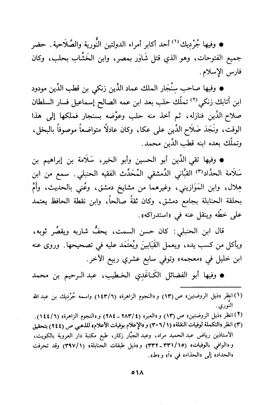 [3] انظر «التكملة لوفيات النقلة» (1/ 306) و «الإعلام بوفيات الأعلام» للذهبي ص (244) بتحقيق الأستاذين رياض عبد الحميد مراد، وعبد الجبّار زكار، طبع مكتبة دار العروبة بالكويت، و «الوافي بالوفيات» (15/ 331- 332) و «ذيل طبقات الحنابلة» (1/ 397) وقد تحرفت «الحداد» إلى «الحذاء» في «آ» و «ط» .