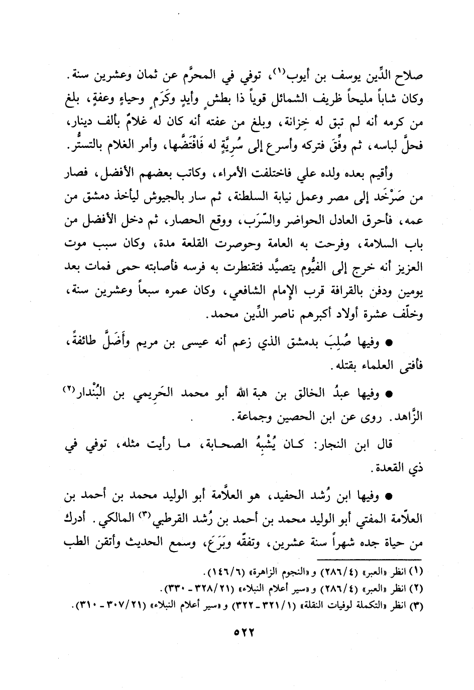 وفيها ابن رشد الحفيد، هو العلّامة أبو الوليد محمد بن أحمد بن العلّامة المفتي أبو الوليد محمد بن أحمد بن رشد القرطبي [3] المالكي. أدرك من حياة جده شهرا سنة عشرين، وتفقّه وبرع، وسمع الحديث وأتقن الطب