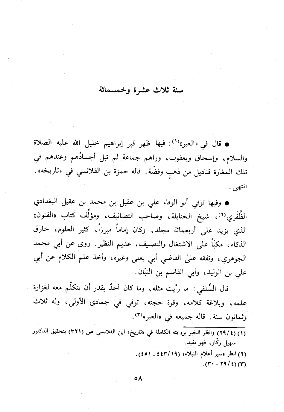 وفيها توفي أبو الوفاء علي بن عقيل بن محمد بن عقيل البغدادي الظّفري [2] ، شيخ الحنابلة، وصاحب التصانيف، ومؤلّف كتاب «الفنون» الذي يزيد على أربعمائة مجلد، وكان إماما مبرزا، كثير العلوم، خارق الذكاء، مكبّا على الاشتغال والتصنيف، عديم النظير. روى عن أبي محمد الجوهري، وتفقه على القاضي أبي يعلى وغيره، وأخذ علم الكلام عن أبي علي بن الوليد، وأبي القاسم بن التبّان.