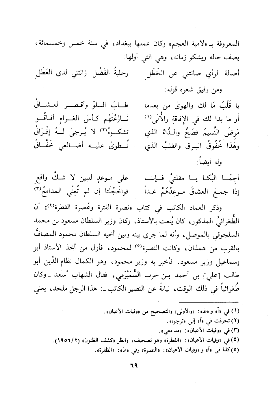 [3] وذكر العماد الكاتب في كتاب «نصرة الفترة وعصرة القطرة [4] » أن الطّغرائيّ المذكور، كان ينعت بالأستاذ، وكان وزير السلطان مسعود بن محمد السلجوقي بالموصل، وأنه لما جرى بينه وبين أخيه السلطان محمود المصافّ بالقرب من همذان، وكانت النصرة [5] لمحمود، فأول من أخذ الأستاذ أبو إسماعيل وزير مسعود، فأخبر به وزير محمود، وهو الكمال نظام الدّين أبو طالب [علي] بن أحمد بن حرب السّميرمي، فقال الشهاب أسعد- وكان طغرائيا في ذلك الوقت، نيابة عن النصير الكاتب: هذا الرجل ملحد، يعني