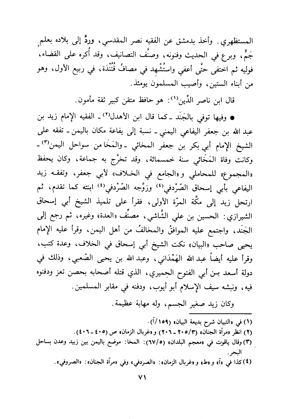 وفيها توفي بالجند- كما قال ابن الأهدل [2]- الفقيه الإمام زيد بن عبد الله بن جعفر اليفاعي اليمني- نسبة إلى يفاعة مكان باليمن- تفقه على الشيخ الإمام أبي بكر بن جعفر المخائي- والمخا من سواحل اليمن [3]- وكانت وفاة المخائي سنة خمسمائة، وقد تخرّج به جماعة، وكان يحفظ «المجموع» للمحاملي و «الجامع في الخلاف» لأبي جعفر، وتفقه زيد اليفاعي بأبي إسحاق الصّردفي [4] وزوّجه الصّردفي [4] ابنته كما تقدم، ثم ارتحل زيد إلى مكّة المرّة الأولى، فقرأ على تلميذ الشيخ أبي إسحاق ارتحل زيد إلى مكّة المرّة الأولى، فقرأ على تلميذ الشيخ أبي إسحاق الشيرازي: الحسين بن علي الشّاشي، مصنّف «العدة» وغيره، ثم رجع إلى الجند، واجتمع عليه الموافق والمخالف من أهل اليمن، وقرأ عليه الإمام يحيى صاحب «البيان» نكت الشيخ أبي إسحاق في الخلاف، وعدة كتب، وقرأ عليه أيضا عبد الله الهمداني، وعبد الله بن يحيى الصّعبي، وذلك في دولة أسعد بن أبي الفتوح الحميري، الذي قتله أصحابه بحصن تعز ودفنوه فيه، ونبشه سيف الإسلام أبو أيوب، ودفنه في مقابر المسلمين.