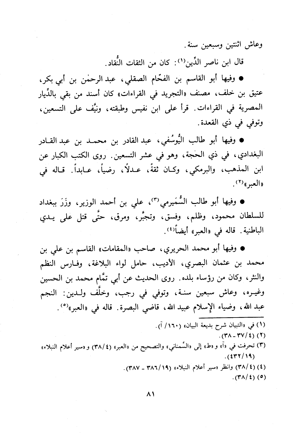 [3] تحرفت في «آ» و «ط» إلى «السّمناني» والتصحيح من «العبر» (4/ 38) و «سير أعلام النبلاء» (19/ 432) .