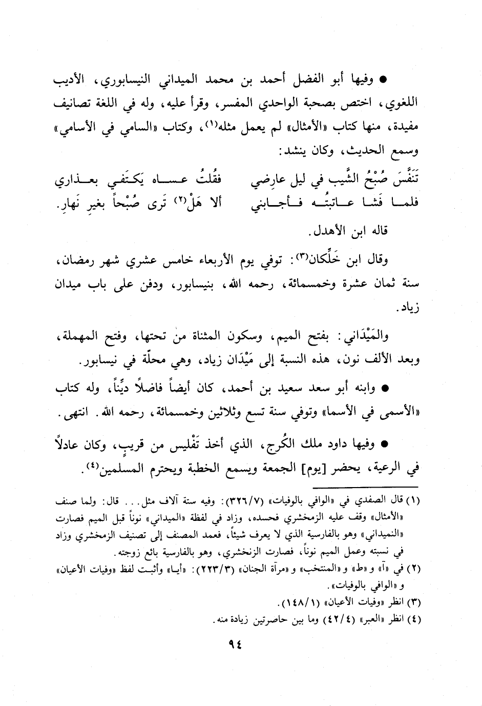 وفيها أبو الفضل أحمد بن محمد الميداني النيسابوري، الأديب اللغوي، اختص بصحبة الواحدي المفسر، وقرأ عليه، وله في اللغة تصانيف مفيدة، منها كتاب «الأمثال» لم يعمل مثله [1] ، وكتاب «السامي في الأسامي» وسمع الحديث، وكان ينشد: