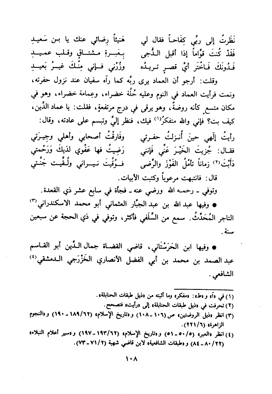 وقلت: أرجو أن العماد يرى ربّه كما رآه سفيان عند نزول حفرته، ونمت فرأيت العماد في النوم وعليه حلّة خضراء، وعمامة خضراء، وهو في مكان متسع كأنه روضة، وهو يرقى في درج مرتفعة، فقلت: يا عماد الدّين، كيف بت؟ فإني والله متفكر [1] فيك، فنظر إليّ وتبسم على عادته، وقال: