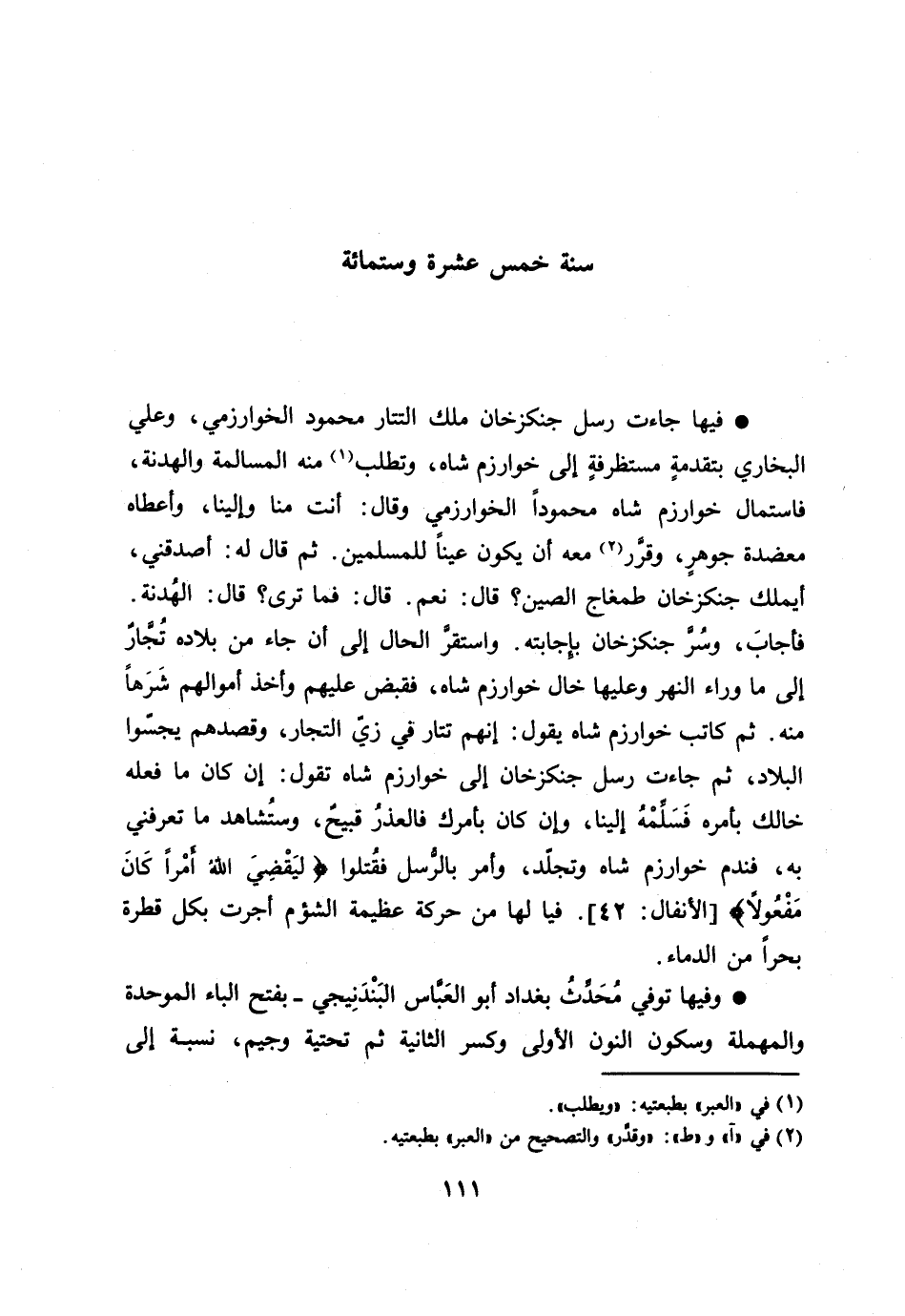 فيها جاءت رسل جنكزخان ملك التتار محمود الخوارزمي، وعلي البخاري بتقدمة مستظرفة إلى خوارزم شاه، وتطلب [1] منه المسالمة والهدنة، فاستمال خوارزم شاه محمودا الخوارزمي وقال: أنت منا وإلينا، وأعطاه معضدة جوهر، وقرّر [2] معه أن يكون عينا للمسلمين. ثم قال له: أصدقني، أيملك جنكزخان طمغاج الصين؟ قال: نعم. قال: فما ترى؟ قال: الهدنة.
