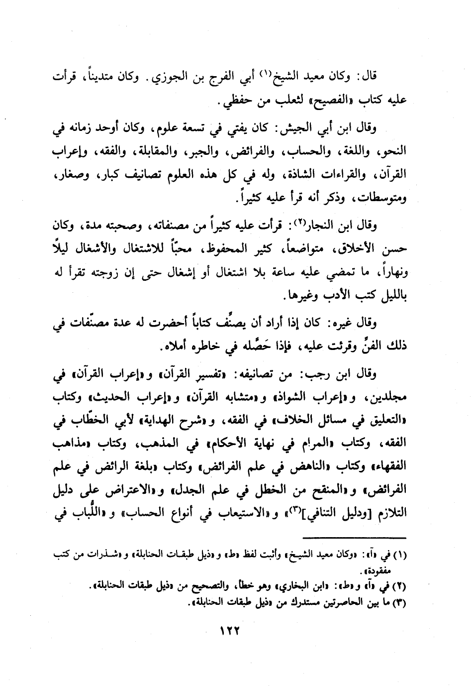 وقال ابن رجب: من تصانيفه: «تفسير القرآن» و «إعراب القرآن» في مجلدين، و «إعراب الشواذ» و «متشابه القرآن» و «إعراب الحديث» وكتاب «التعليق في مسائل الخلاف» في الفقه، و «شرح الهداية» لأبي الخطّاب في الفقه، وكتاب «المرام في نهاية الأحكام» في المذهب، وكتاب «مذاهب الفقهاء» وكتاب «الناهض في علم الفرائض» وكتاب «بلغة الرائض في علم الفرائض» و «المنقح من الخطل في علم الجدل» و «الاعتراض على دليل التلازم [ودليل التنافي] [3] » و «الاستيعاب في أنواع الحساب» و «اللّباب في