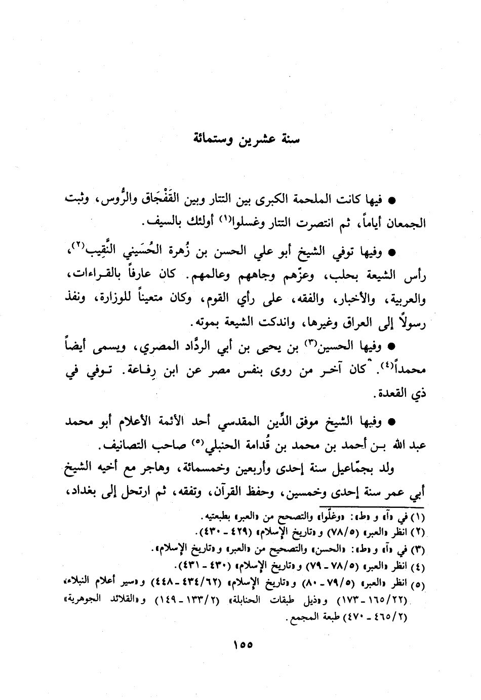 وفيها الشيخ موفق الدّين المقدسي أحد الأئمة الأعلام أبو محمد عبد الله بن أحمد بن محمد بن قدامة الحنبلي [5] صاحب التصانيف.