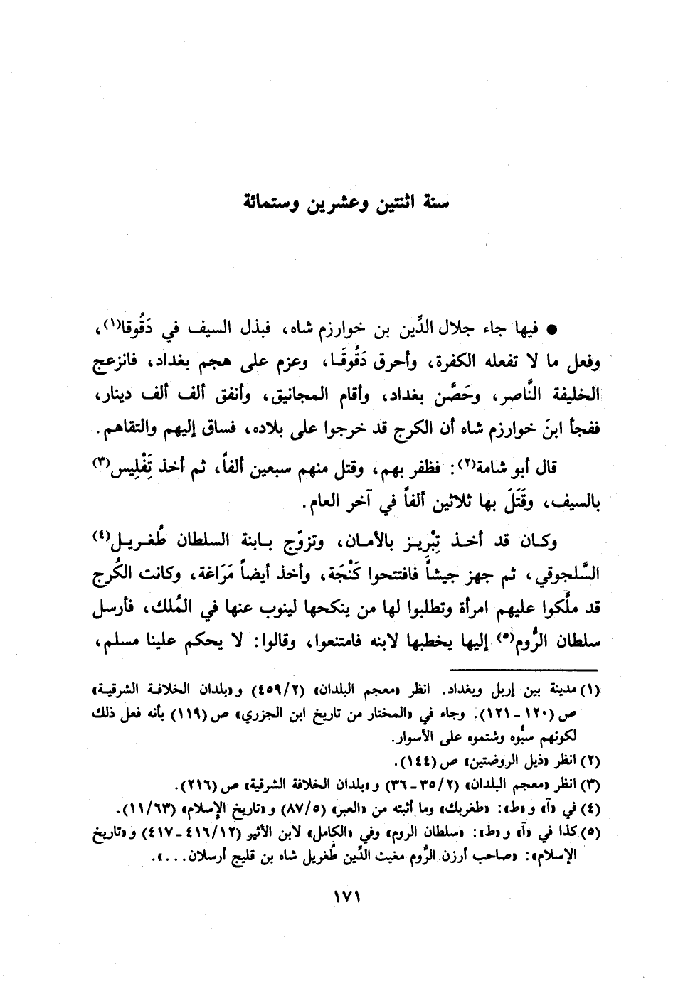 [5] كذا في «آ» و «ط» : «سلطان الروم» وفي «الكامل» لابن الأثير (12/ 416- 417) و «تاريخ الإسلام» : «صاحب أرزن الرّوم مغيث الدّين طغريل شاه بن قليج أرسلان ... » .