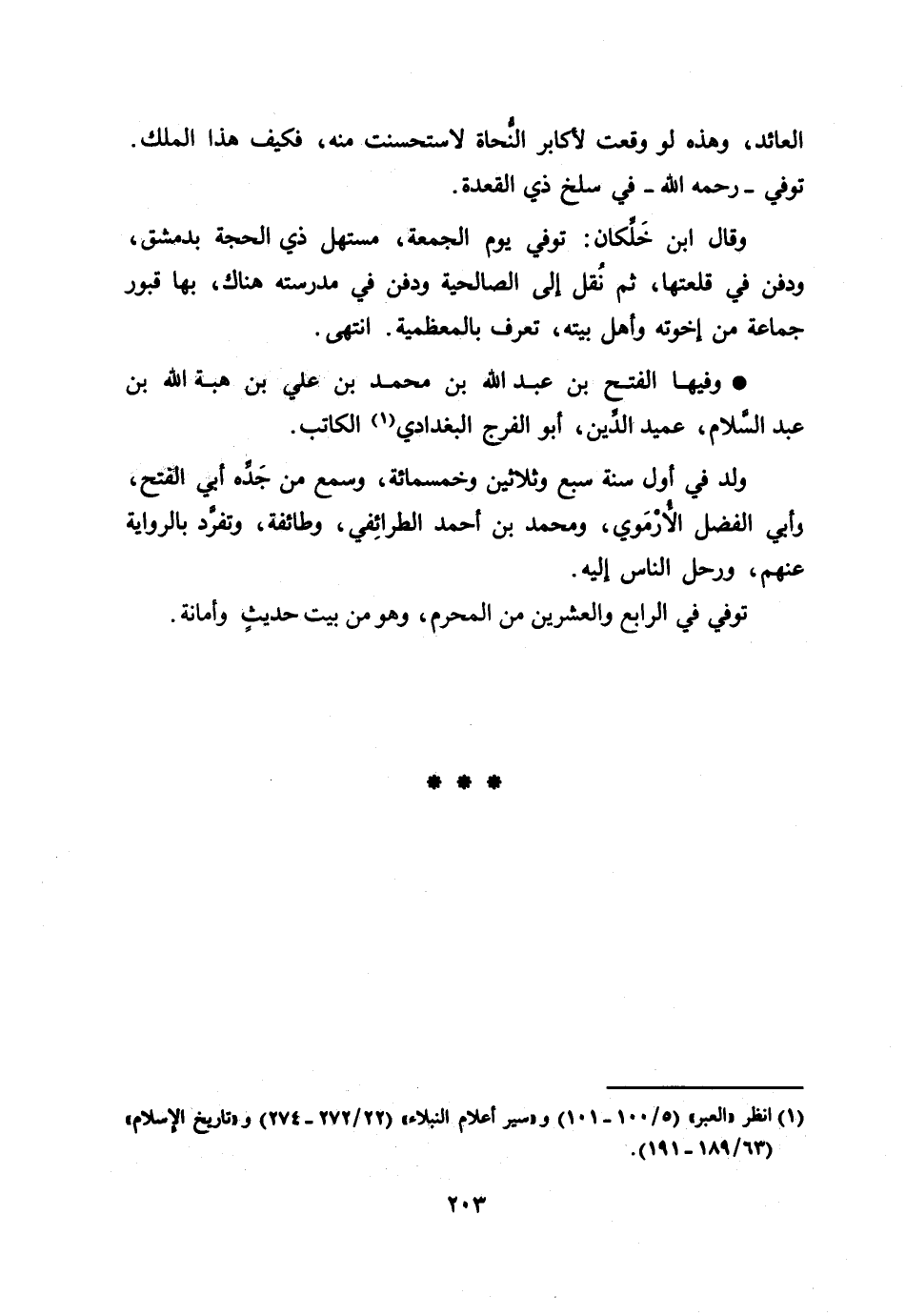 وفيها الفتح بن عبد الله بن محمد بن علي بن هبة الله بن عبد السّلام، عميد الدّين، أبو الفرج البغدادي [1] الكاتب.