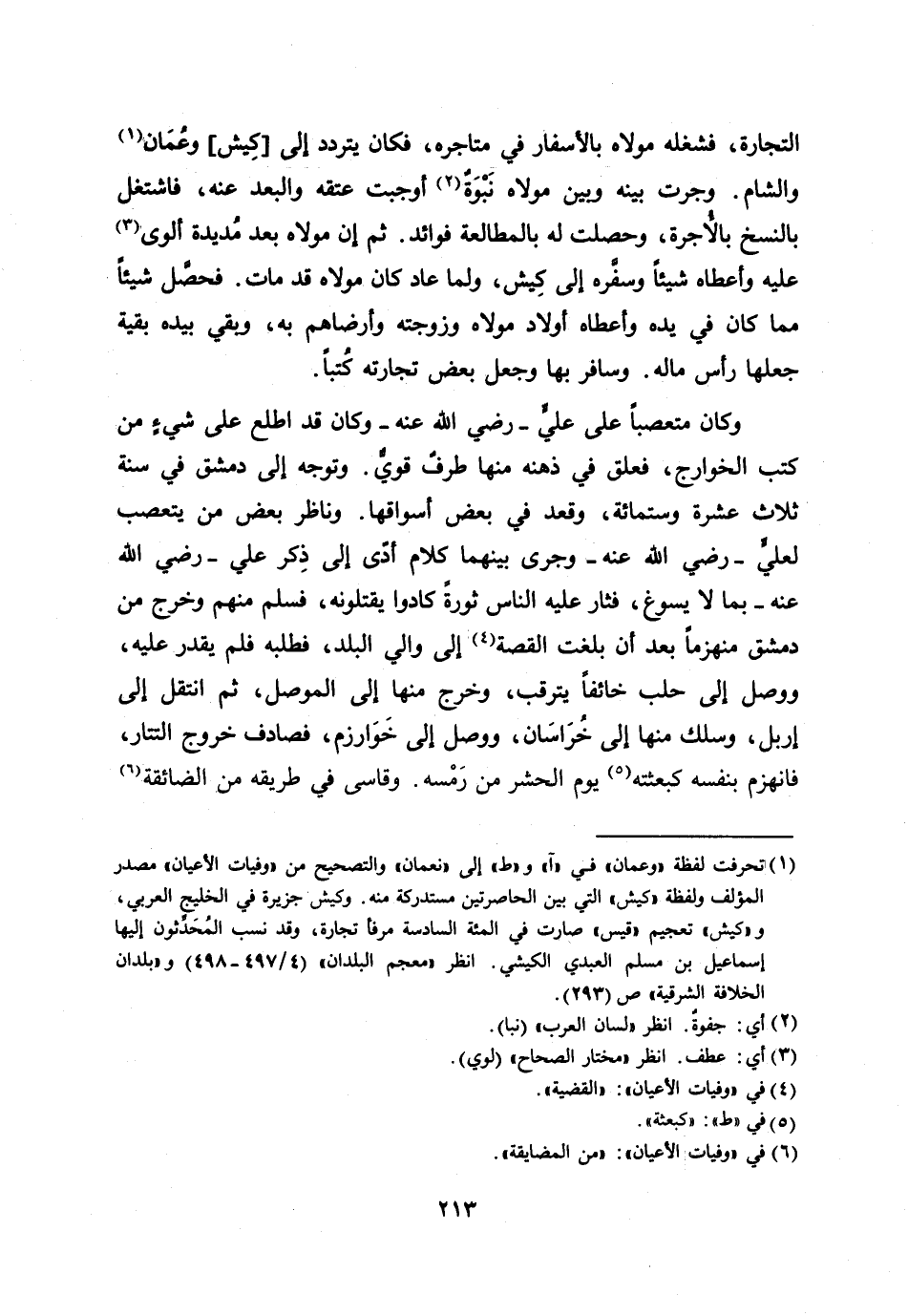 [1] تحرفت لفظة «وعمان» في «آ» و «ط» إلى «نعمان» والتصحيح من «وفيات الأعيان» مصدر المؤلف ولفظة «كيش» التي بين الحاصرتين مستدركة منه. وكيش جزيرة في الخليج العربي، و «كيش» تعجيم «قيس» صارت في المئة السادسة مرفأ تجارة، وقد نسب المحدّثون إليها إسماعيل بن مسلم العبدي الكيشي. انظر «معجم البلدان» (4/ 497- 498) و «بلدان الخلافة الشرقية» ص (293) .