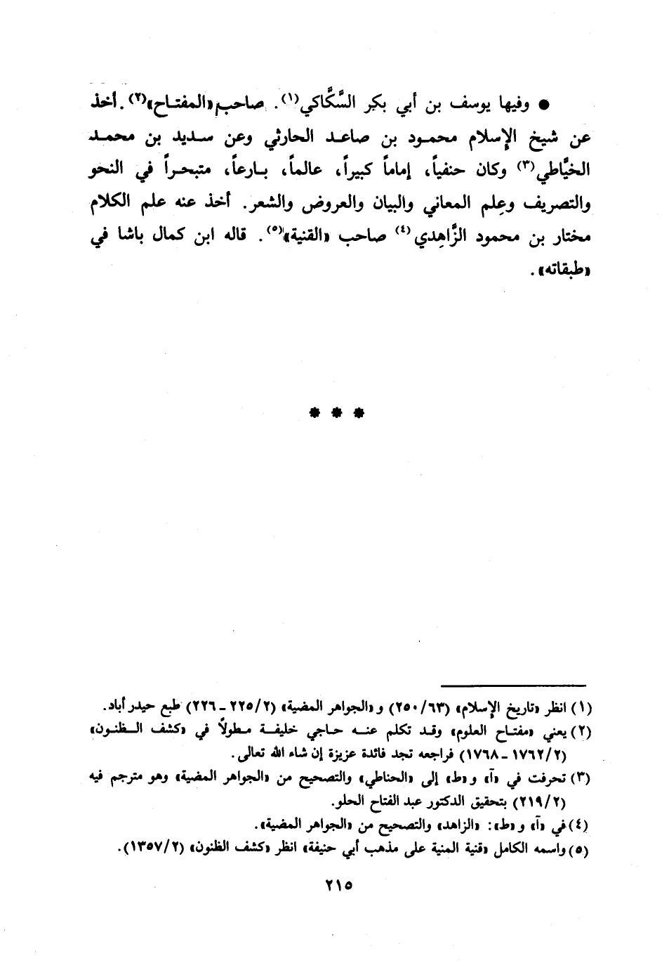 وفيها يوسف بن أبي بكر السّكّاكي [1] . صاحب «المفتاح» [2] . أخذ عن شيخ الإسلام محمود بن صاعد الحارثي وعن سديد بن محمد الخيّاطي [3] وكان حنفيا، إماما كبيرا، عالما، بارعا، متبحرا في النحو والتصريف وعلم المعاني والبيان والعروض والشعر. أخذ عنه علم الكلام مختار بن محمود الزّاهدي [4] صاحب «القنية» [5] . قاله ابن كمال باشا في «طبقاته» .