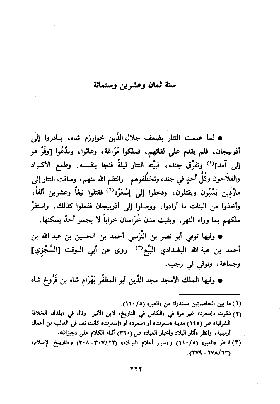 لما علمت التتار بضعف جلال الدّين خوارزم شاه، بادروا إلى أذربيجان، فلم يقدم على لقائهم، فملكوا مراغة، وعاثوا، وبدّعوا [وفرّ هو إلى آمد] [1] وتفرّق جنده، فبيّته التتار ليلة فنجا بنفسه. وطمع الأكراد والفلّاحون وكلّ أحد في جنده وتخطّفوهم. وانتقم الله منهم، وساقت التتار إلى ماردين يسبون ويقتلون، ودخلوا إلى إسعرد [2] فقتلوا نيفا وعشرين ألفا، وأخذوا من البنات ما أرادوا، ووصلوا إلى أذربيجان ففعلوا كذلك، واستقرّ ملكهم بما وراء النهر، وبقيت مدن خراسان خرابا لا يجسر أحد يسكنها.