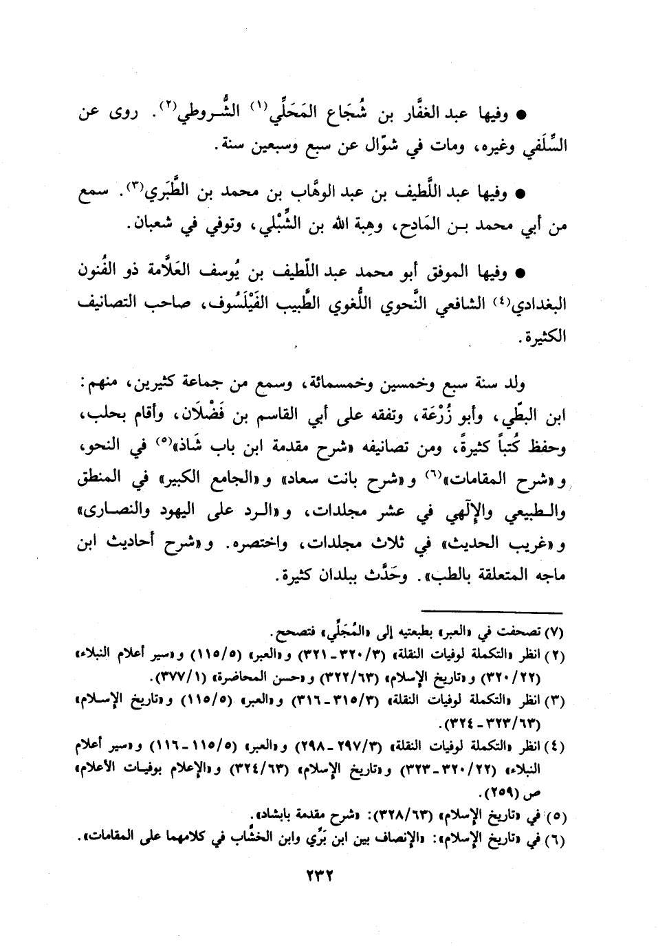 وفيها الموفق أبو محمد عبد اللّطيف بن يوسف العلّامة ذو الفنون البغدادي [4] الشافعي النّحوي اللّغوي الطّبيب الفيلسوف، صاحب التصانيف الكثيرة.