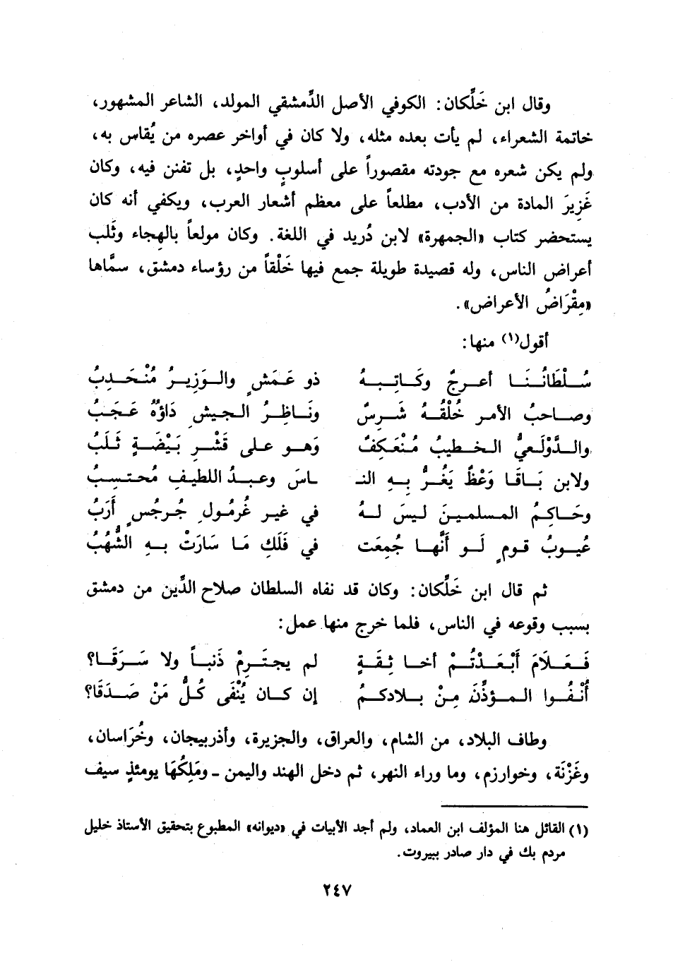 [1] القائل هنا المؤلف ابن العماد، ولم أجد الأبيات في «ديوانه» المطبوع بتحقيق الأستاذ خليل مردم بك في دار صادر ببيروت.