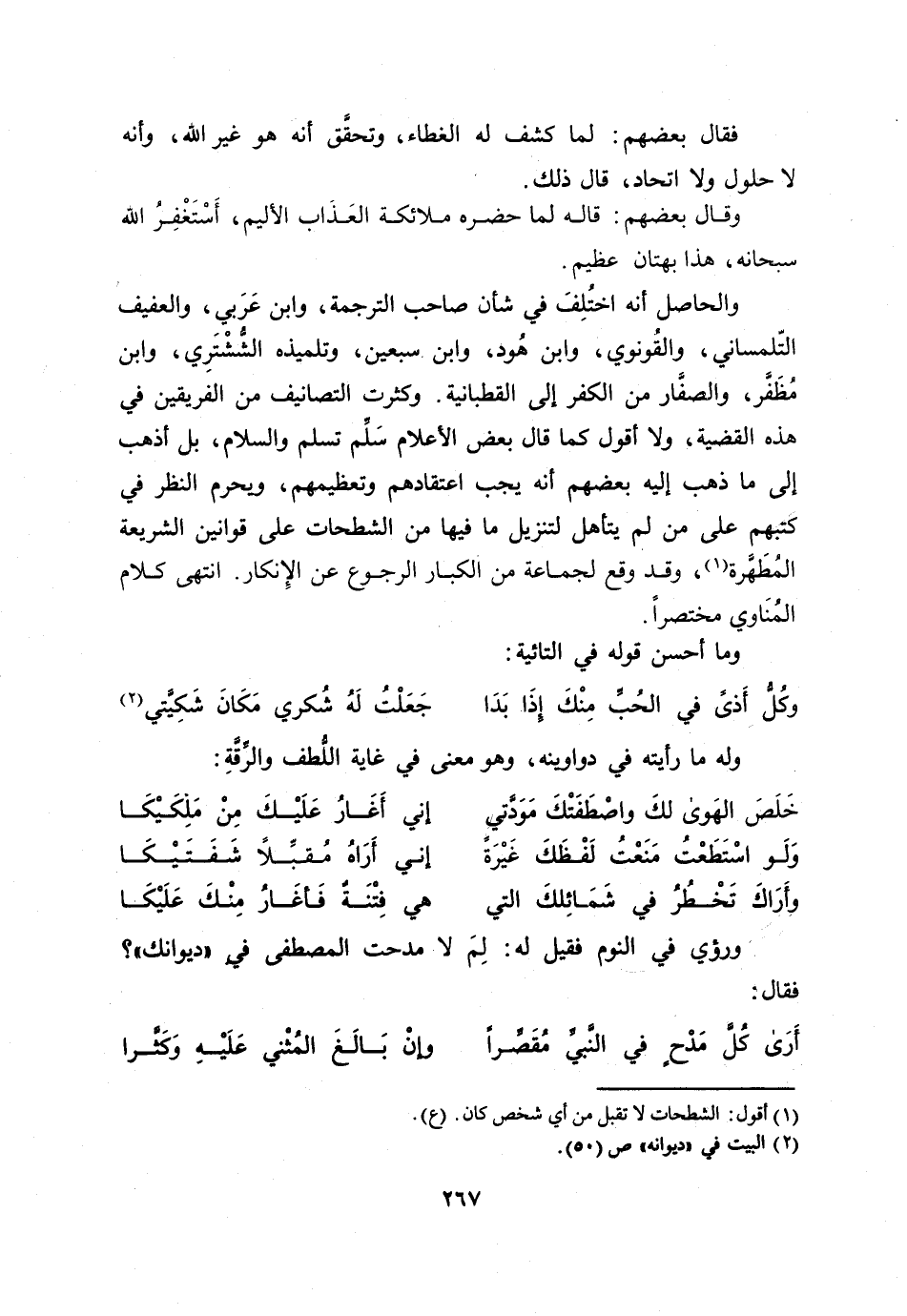 والحاصل أنه اختلف في شأن صاحب الترجمة، وابن عربي، والعفيف التّلمساني، والقونوي، وابن هود، وابن سبعين، وتلميذه الشّشتري، وابن مظفّر، والصفّار من الكفر إلى القطبانية. وكثرت التصانيف من الفريقين في هذه القضية، ولا أقول كما قال بعض الأعلام سلّم تسلم والسلام، بل أذهب إلى ما ذهب إليه بعضهم أنه يجب اعتقادهم وتعظيمهم، ويحرم النظر في كتبهم على من لم يتأهل لتنزيل ما فيها من الشطحات على قوانين الشريعة المطهّرة [1] ، وقد وقع لجماعة من الكبار الرجوع عن الإنكار. انتهى كلام المناوي مختصرا.