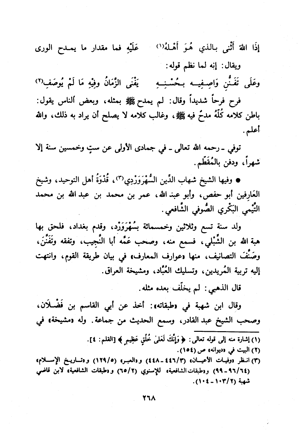 وفيها الشيخ شهاب الدّين السّهروردي [3] ، قدوة أهل التوحيد، وشيخ العارفين أبو حفص، وأبو عبد الله، عمر بن محمد بن عبد الله بن محمد التّيمي البكري الصّوفي الشّافعي.