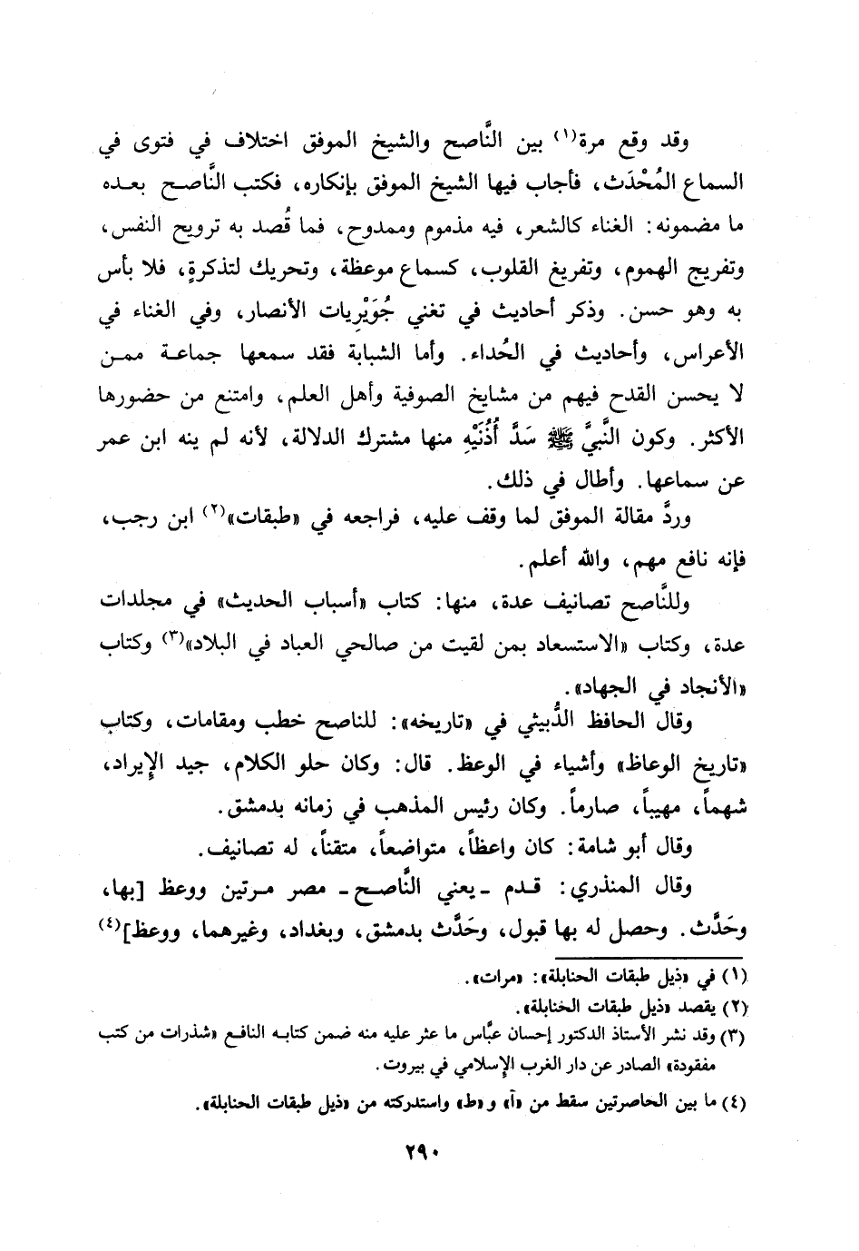 وقد وقع مرة [1] بين النّاصح والشيخ الموفق اختلاف في فتوى في السماع المحدث، فأجاب فيها الشيخ الموفق بإنكاره، فكتب النّاصح بعده ما مضمونه: الغناء كالشعر، فيه مذموم وممدوح، فما قصد به ترويح النفس، وتفريج الهموم، وتفريغ القلوب، كسماع موعظة، وتحريك لتذكرة، فلا بأس به وهو حسن. وذكر أحاديث في تغني جويريات الأنصار، وفي الغناء في الأعراس، وأحاديث في الحداء. وأما الشبابة فقد سمعها جماعة ممن لا يحسن القدح فيهم من مشايخ الصوفية وأهل العلم، وامتنع من حضورها الأكثر. وكون النّبيّ صلى الله عليه وسلّم سدّ أذنيه منها مشترك الدلالة، لأنه لم ينه ابن عمر عن سماعها. وأطال في ذلك.