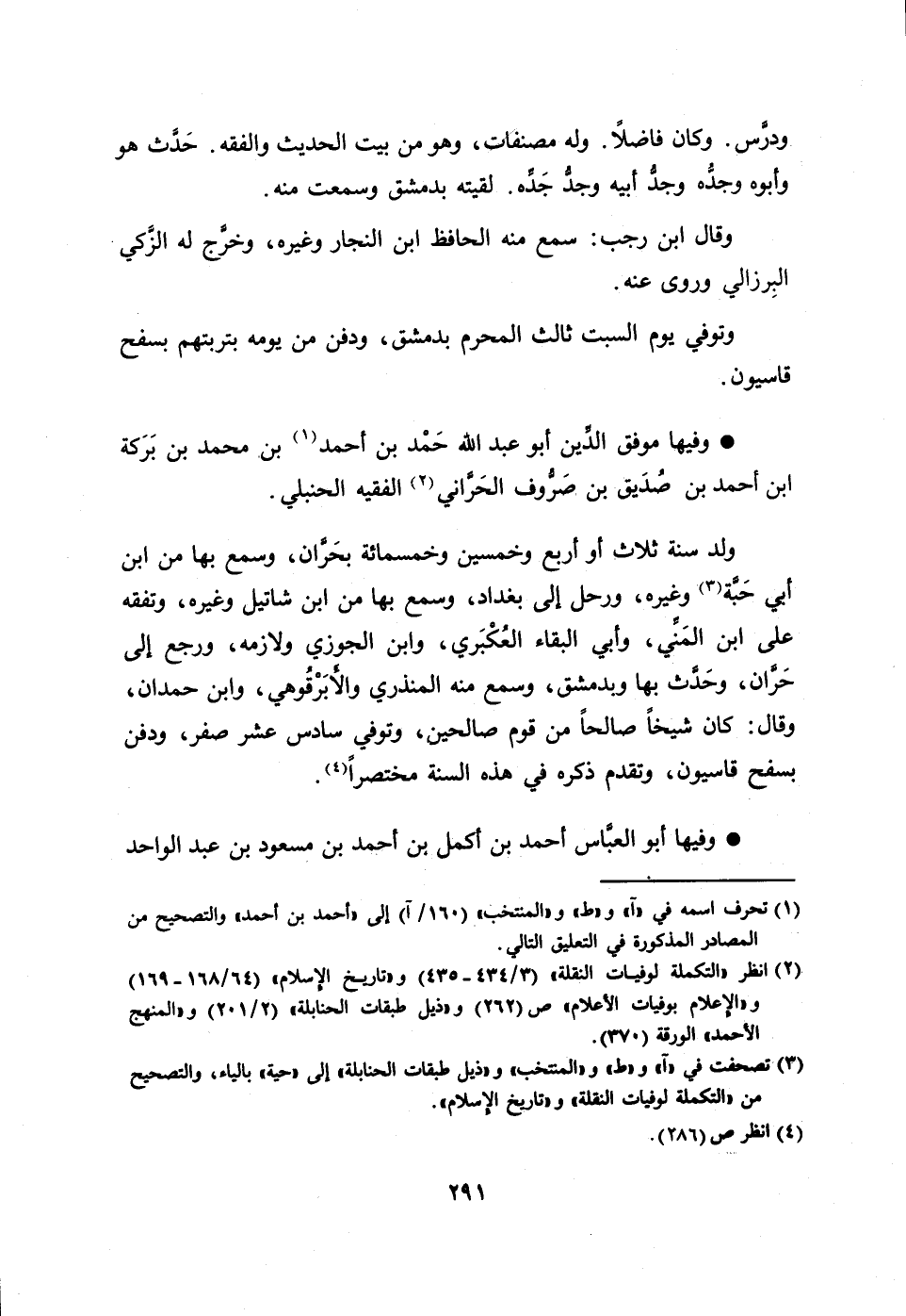 [2] انظر «التكملة لوفيات النقلة» (3/ 434- 435) و «تاريخ الإسلام» (64/ 168- 169) و «الإعلام بوفيات الأعلام» ص (262) و «ذيل طبقات الحنابلة» (2/ 201) و «المنهج الأحمد» الورقة (370) .