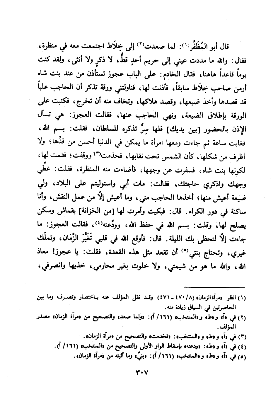 قال أبو المظفّر [1] : لما صعدت [2] إلى خلاط اجتمعت معه في منظرة، فقال: والله ما مددت عيني إلى حريم أحد قطّ، لا ذكر ولا أنثى، ولقد كنت يوما قاعدا هاهنا، فقال الخادم: على الباب عجوز تستأذن من عند بنت شاه أرمن صاحب خلاط سابقا، فأذنت لها، فناولتني ورقة تذكر أن الحاجب عليا قد قصدها وأخذ ضيعها، وقصد هلاكها، وتخاف منه أن تخرج، فكتبت على الورقة بإطلاق الضيعة، ونهي الحاجب عنها، فقالت العجوز: هي تسأل الإذن بالحضور [بين يديك] فلها سرّ تذكره للسلطان، فقلت: بسم الله، فغابت ساعة ثم جاءت ومعها امرأة ما يمكن في الدنيا أحسن من قدّها، ولا أظرف من شكلها، كأن الشمس تحت نقابها، فحذمت [3] ووقفت، فقمت لها، لكونها بنت شاه، فسفرت عن وجهها، فأضاءت منه المنظرة، فقلت: غطّي وجهك واذكري حاجتك، فقالت: مات أبي واستوليتم على البلاد، ولي ضيعة أعيش منها، أخذها الحاجب مني، وما أعيش إلّا من عمل النقش، وأنا ساكنة في دور الكراء. قال: فبكيت وأمرت لها [من الخزانة] بقماش وسكن يصلح لها، وقلت: بسم الله في حفظ الله، وودّعته [4] ، فقالت العجوز: ما جاءت إلّا لتحظى بك الليلة. قال: فأوقع الله في قلبي تغيّر الزّمان، وتملّك غيري، وتحتاج بنتي [5] أن تقعد مثل هذه القعدة، فقلت: يا عجوز! معاذ الله، والله ما هو من شيمتي، ولا خلوت بغير محارمي، خذيها وانصرفي،
