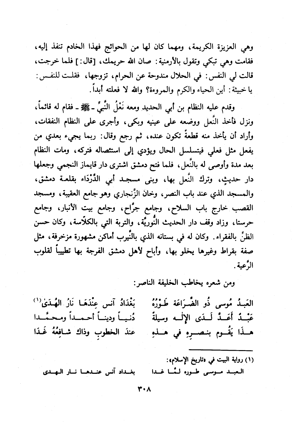 وهي العزيزة الكريمة، ومهما كان لها من الحوائج فهذا الخادم تنفذ إليه، فقامت وهي تبكي وتقول بالأرمنية: صان الله حريمك، [قال:] فلما خرجت، قالت لي النفس: في الحلال مندوحة عن الحرام، تزوجها، فقلت للنفس: