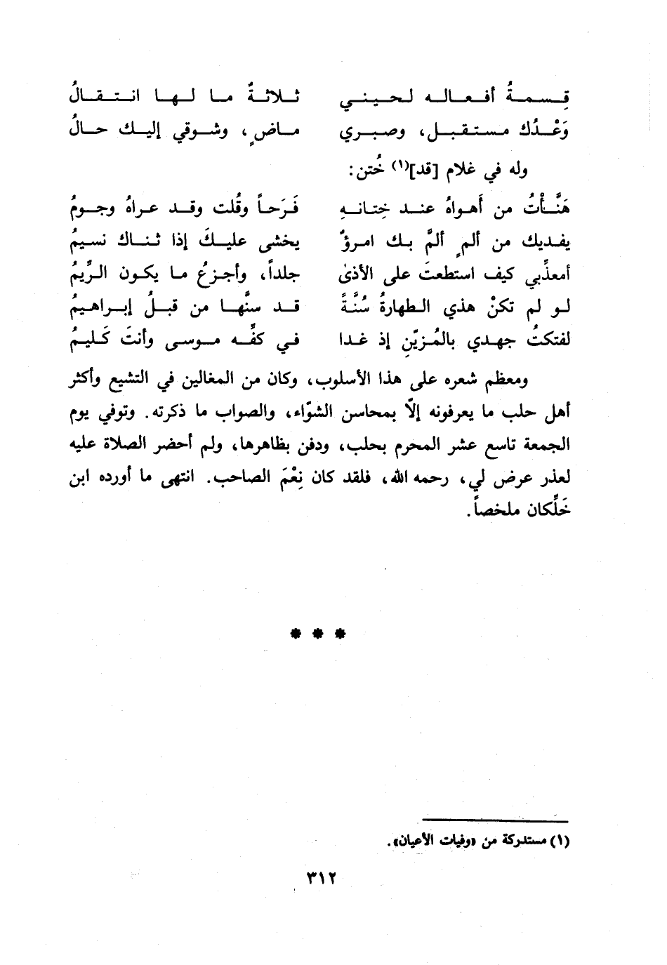 ومعظم شعره على هذا الأسلوب، وكان من المغالين في التشيع وأكثر أهل حلب ما يعرفونه إلّا بمحاسن الشوّاء، والصواب ما ذكرته. وتوفي يوم الجمعة تاسع عشر المحرم بحلب، ودفن بظاهرها، ولم أحضر الصلاة عليه لعذر عرض لي، رحمه الله، فلقد كان نعم الصاحب. انتهى ما أورده ابن خلّكان ملخصا.