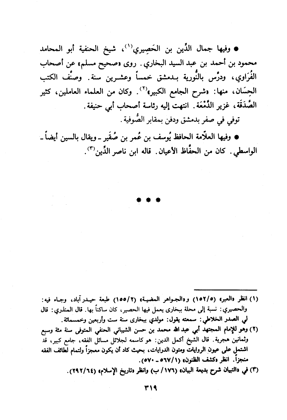 وفيها جمال الدّين بن الحصيري [1] ، شيخ الحنفية أبو المحامد محمود بن أحمد بن عبد السيد البخاري. روى «صحيح مسلم» عن أصحاب الفراوي، ودرّس بالنّورية بدمشق خمسا وعشرين سنة. وصنّف الكتب الحسان، منها: «شرح الجامع الكبير» [2] . وكان من العلماء العاملين، كثير الصّدقة، غزير الدّمعة. انتهت إليه رئاسة أصحاب أبي حنيفة.
