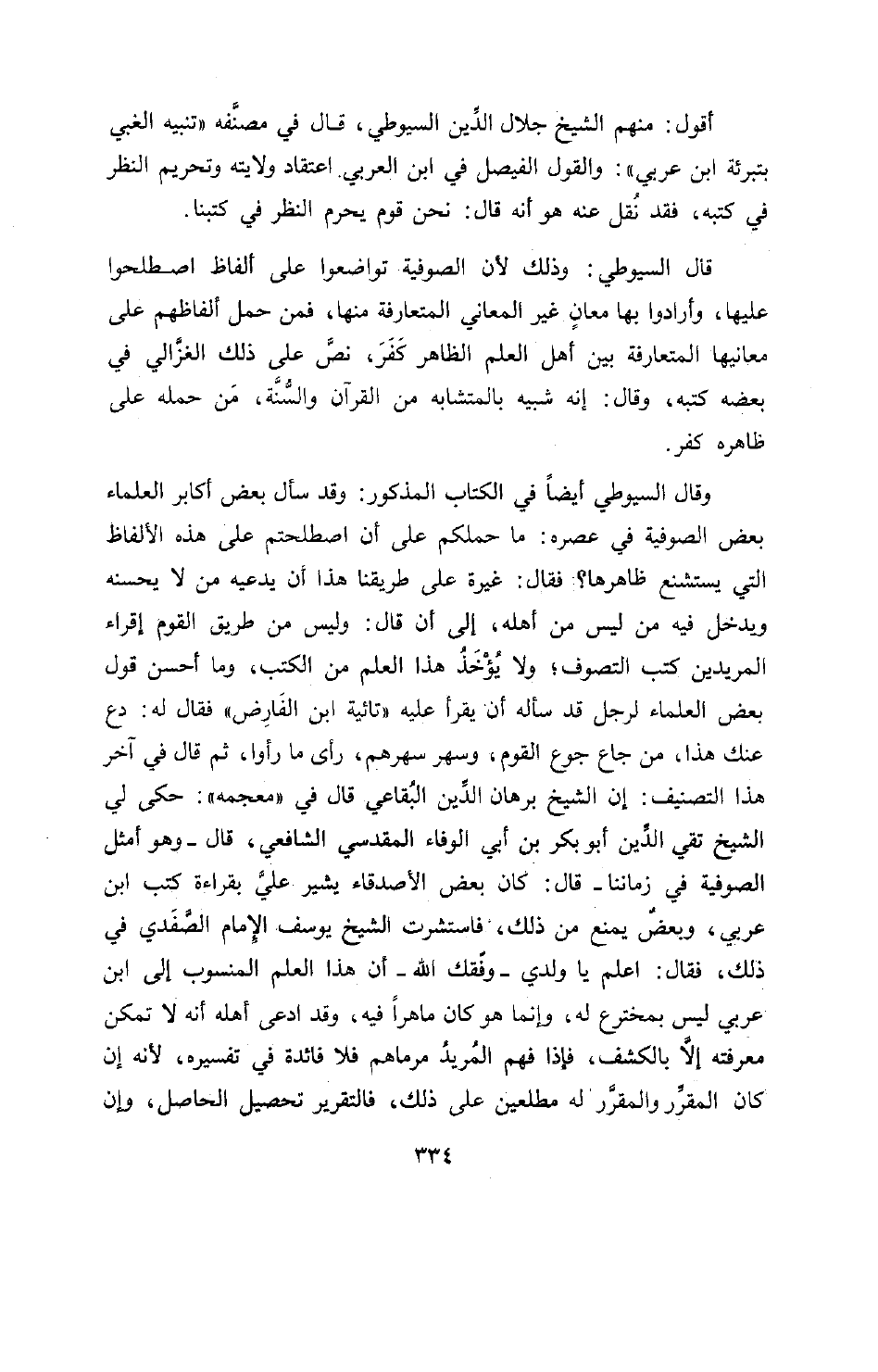 أقول: منهم الشيخ جلال الدّين السيوطي، قال في مصنّفه «تنبيه الغبي بتبرئة ابن عربي» : والقول الفيصل في ابن العربي اعتقاد ولايته وتحريم النظر في كتبه، فقد نقل عنه هو أنه قال: نحن قوم يحرم النظر في كتبنا.