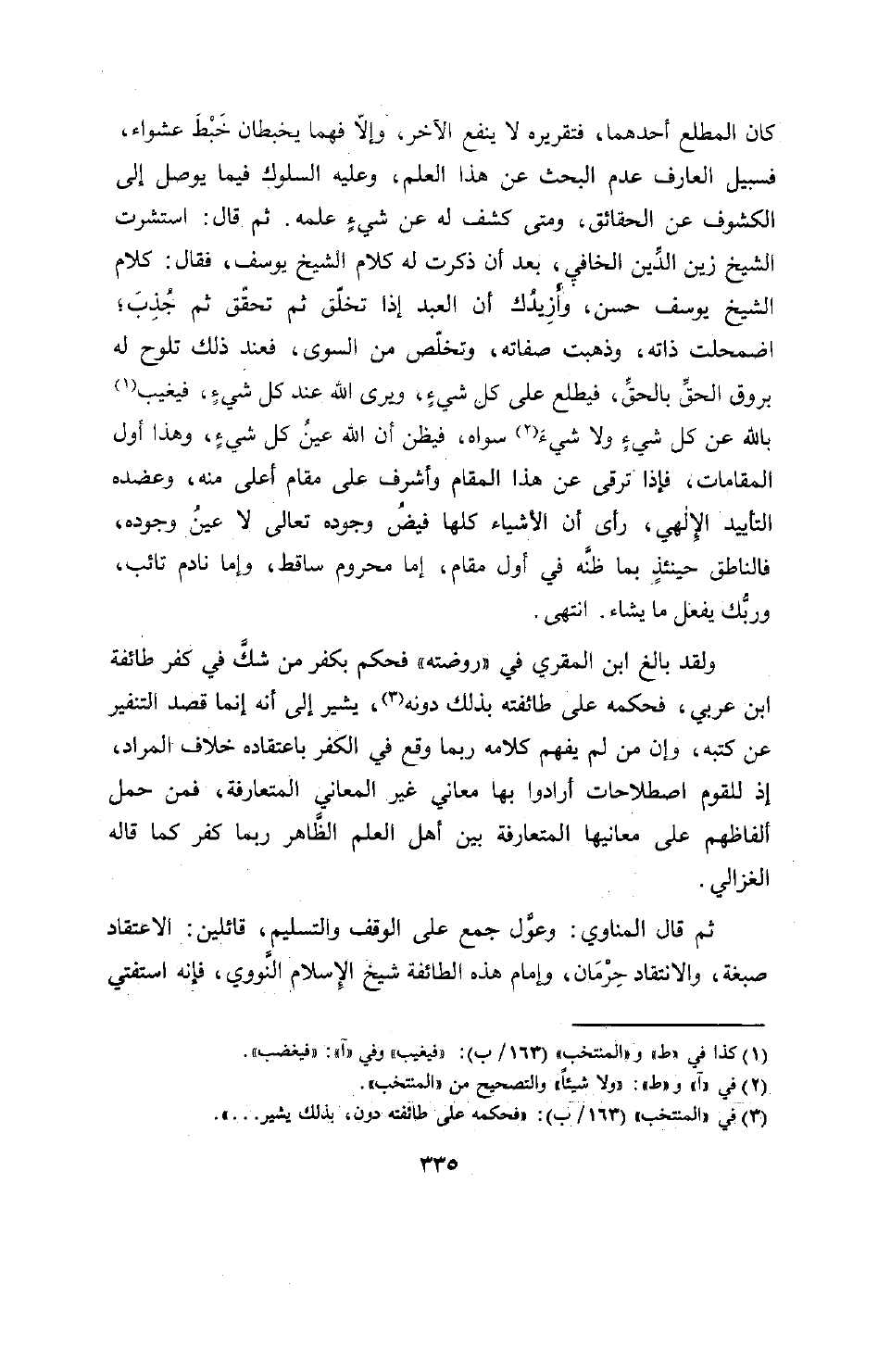 ولقد بالغ ابن المقري في «روضته» فحكم بكفر من شكّ في كفر طائفة ابن عربي، فحكمه على طائفته بذلك دونه [3] ، يشير إلى أنه إنما قصد التنفير عن كتبه، وإن من لم يفهم كلامه ربما وقع في الكفر باعتقاده خلاف المراد، إذ للقوم اصطلاحات أرادوا بها معاني غير المعاني المتعارفة، فمن حمل ألفاظهم على معانيها المتعارفة بين أهل العلم الظّاهر ربما كفر كما قاله الغزالي.