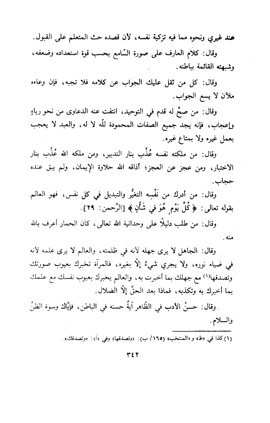 وقال: من أدرك من نفسه التغيّر والتبديل في كل نفس، فهو العالم بقوله تعالى: كُلَّ يَوْمٍ هُوَ في شَأْنٍ 55: 29 [الرّحمن: 29] .