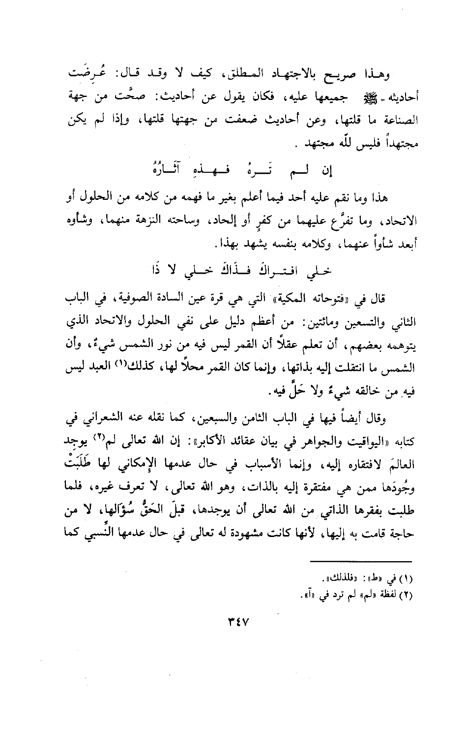 قال في «فتوحاته المكية» التي هي قرة عين السادة الصوفية، في الباب الثاني والتسعين ومائتين: من أعظم دليل على نفي الحلول والاتحاد الذي يتوهمه بعضهم، أن تعلم عقلا أن القمر ليس فيه من نور الشمس شيء، وأن الشمس ما انتقلت إليه بذاتها، وإنما كان القمر محلا لها، كذلك [1] العبد ليس فيه من خالقه شيء ولا حلّ فيه.