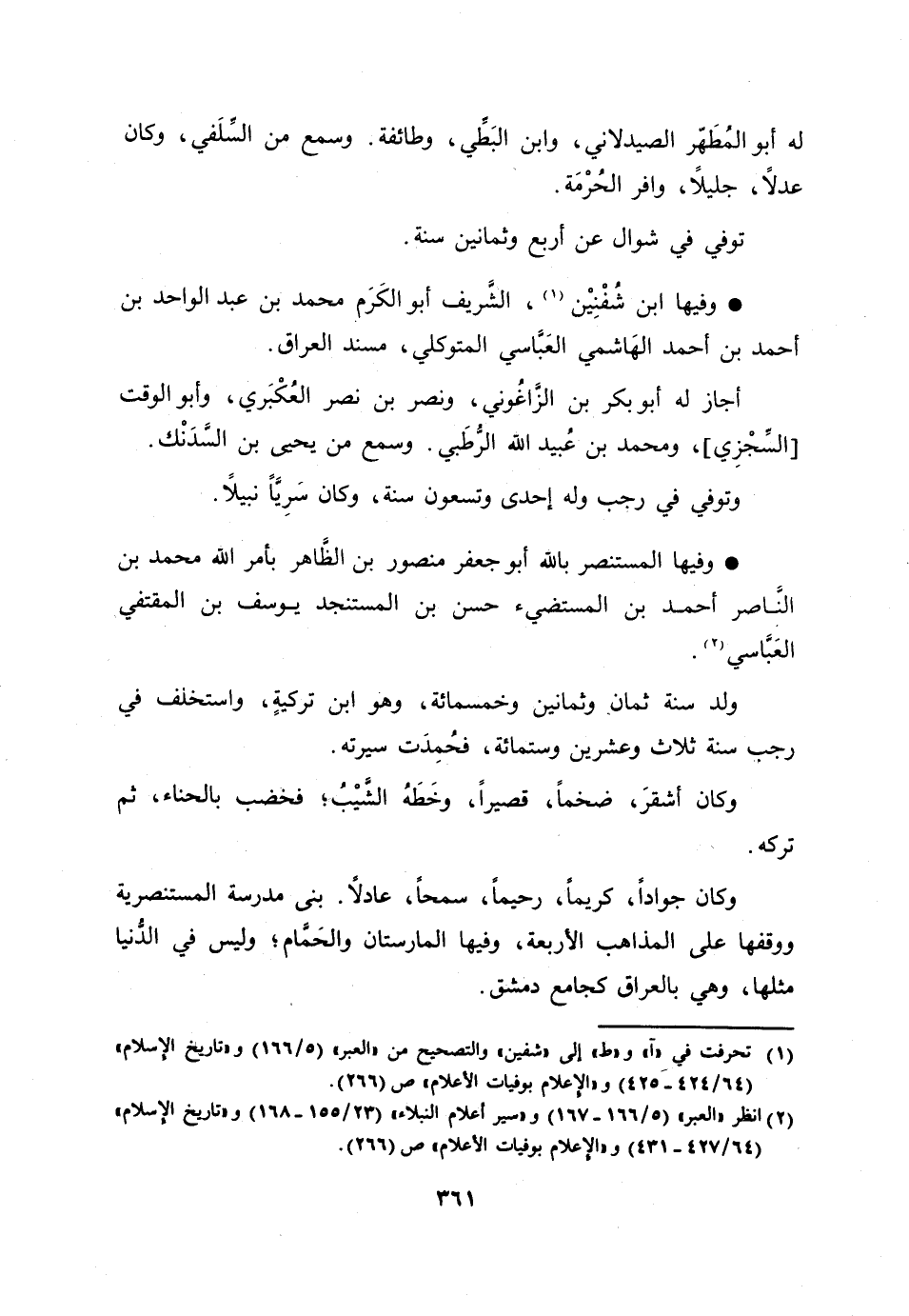 وفيها المستنصر بالله أبو جعفر منصور بن الظّاهر بأمر الله محمد بن النّاصر أحمد بن المستضيء حسن بن المستنجد يوسف بن المقتفي العبّاسي [2] .