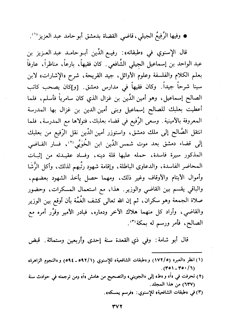 قال الإسنوي في «طبقاته» : رفيع الدّين أبو حامد عبد العزيز بن عبد الواحد بن إسماعيل الجيلي الشّافعي. كان فقيها، بارعا، مناظرا، عارفا بعلم الكلام والفلسفة وعلوم الأوائل، جيد القريحة، شرح «الإشارات» لابن سينا شرحا جيدا. وكان فقيها في مدارس دمشق. [و] كان يصحب كاتب الصالح إسماعيل، وهو أمين الدّين بن غزال الذي كان سامريا فأسلم، فلما أعطيت بعلبك للصالح إسماعيل وبنى أمين الدّين بن غزال بها المدرسة المعروفة بالأمينية. وسعى الرّفيع في قضاء بعلبك، فتولاها مع المدرسة، فلما انتقل الصّالح إلى ملك دمشق، واستوزر أمين الدّين نقل الرّفيع من بعلبك إلى قضاء دمشق بعد موت شمس الدّين ابن الخويي [2] ، فسار القاضي المذكور سيرة فاسدة، حمله عليها قلة دينه، وفساد عقيدته من إثبات المحاضر الفاسدة، والدعاوى الباطلة، وإقامة شهود رتّبهم لذلك، وأكل الرّشا وأموال الأيتام والأوقاف وغير ذلك، ومهما حصل يأخذ الشهود بعضهم، والباقي يقسم بين القاضي والوزير. هذا، مع استعمال المسكرات، وحضور صلاة الجمعة وهو سكران، ثم إن الله تعالى كشف الغمّة بأن أوقع بين الوزير والقاضي، وأراد كل منهما هلاك الآخر ودماره، فبادر الأمير وقرّر أمره مع الصالح، فأمر ورسم له بمكة [3] .