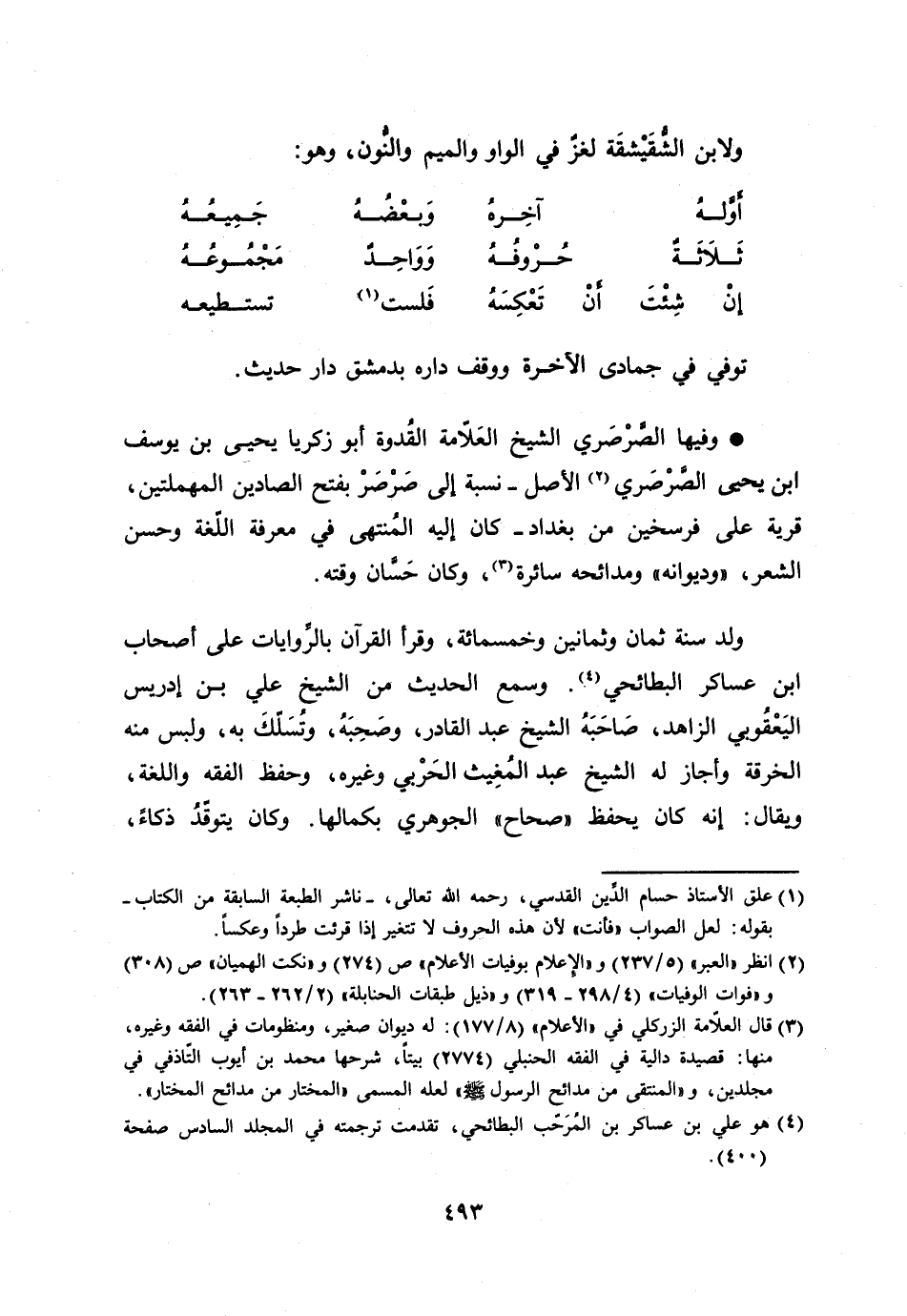 وفيها الصّرصري الشيخ العلّامة القدوة أبو زكريا يحيى بن يوسف ابن يحيى الصّرصري [2] الأصل- نسبة إلى صرصر بفتح الصادين المهملتين، قرية على فرسخين من بغداد- كان إليه المنتهى في معرفة اللّغة وحسن الشعر، «وديوانه» ومدائحه سائرة [3] ، وكان حسّان وقته.