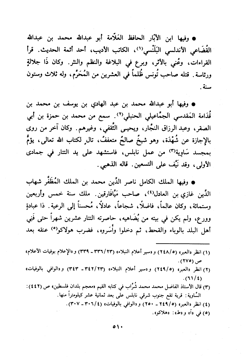 وفيها أبو عبد الله محمد بن عبد الهادي بن يوسف بن محمد بن قدامة المقدسي الجمّاعيلي الحنبلي [2] . سمع من محمد بن حمزة بن أبي الصقر، وعبد الرزاق النجّار، ويحيى الثّقفي، وغيرهم. وكان آخر من روى بالإجازة عن شهدة، وهو شيخ صالح متعفف، تال لكتاب الله تعالى، يؤمّ بمسجد ساوية [3] من عمل نابلس، فاستشهد على يد التتار في جمادى الأولى، وقد نيّف على التسعين. قاله الذهبي.