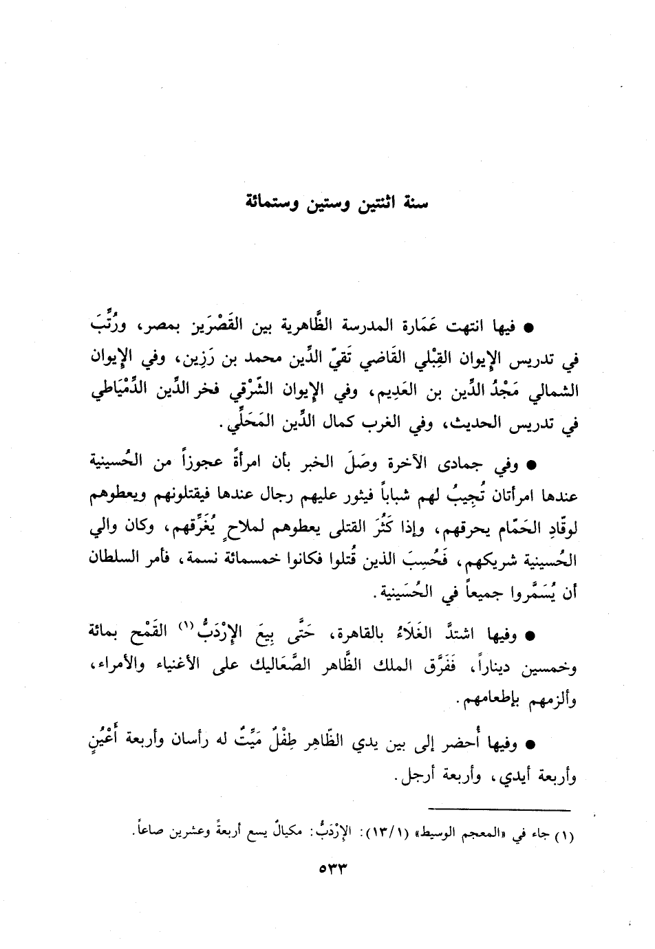 وفيها أحضر إلى بين يدي الظّاهر طفل ميّت له رأسان وأربعة أعين وأربعة أيدي، وأربعة أرجل.