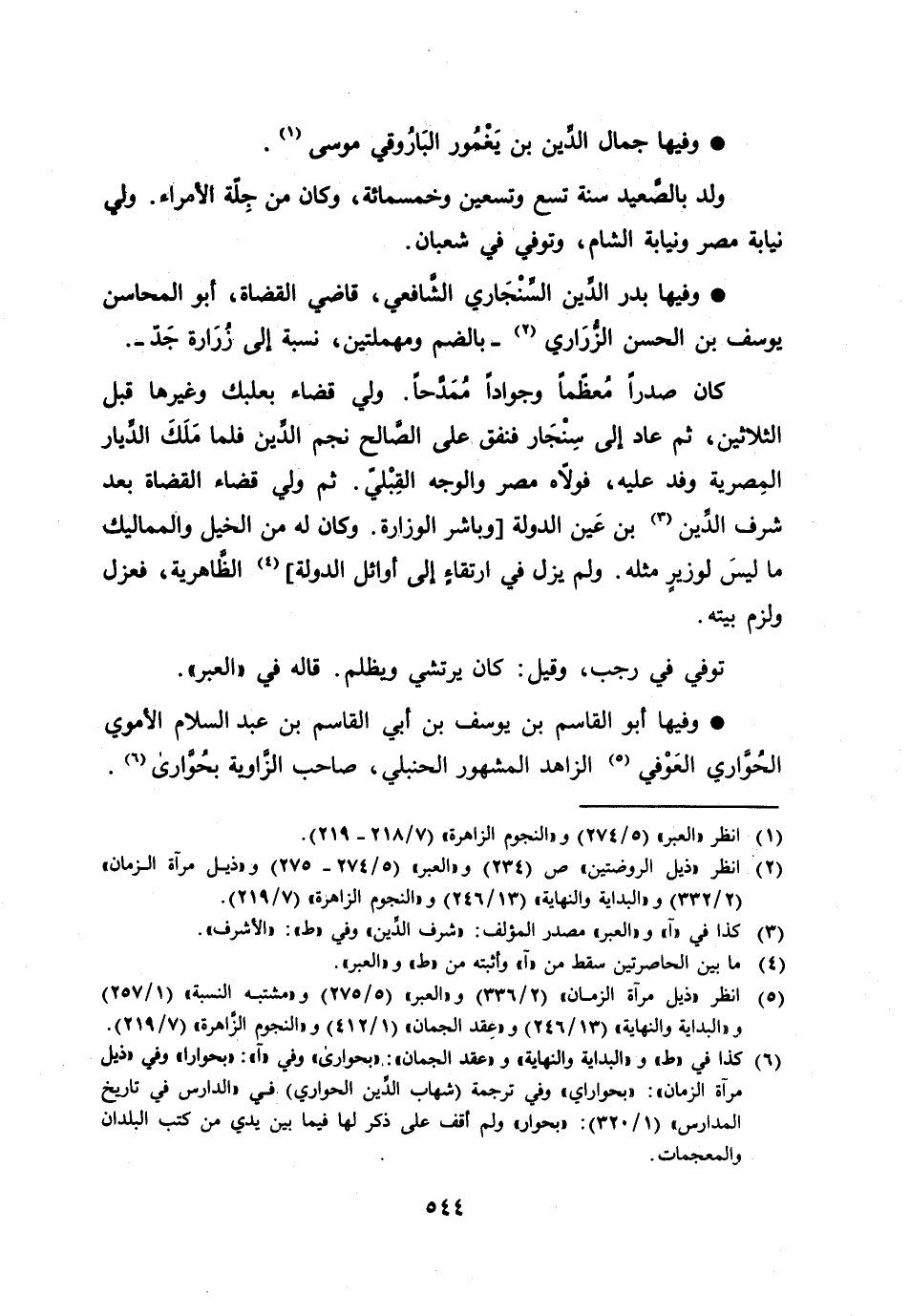 وفيها بدر الدّين السّنجاري الشّافعي، قاضي القضاة، أبو المحاسن يوسف بن الحسن الزّراري [2]- بالضم ومهملتين، نسبة إلى زرارة جدّ-.