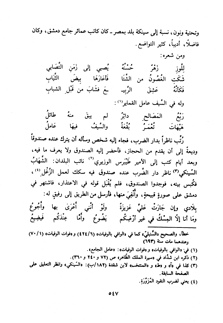 وتحتية ونون، نسبة إلى سينكة بلد بمصر- كان كاتب عمائر جامع دمشق، وكان فاضلا، أديبا، كثير التواضع.