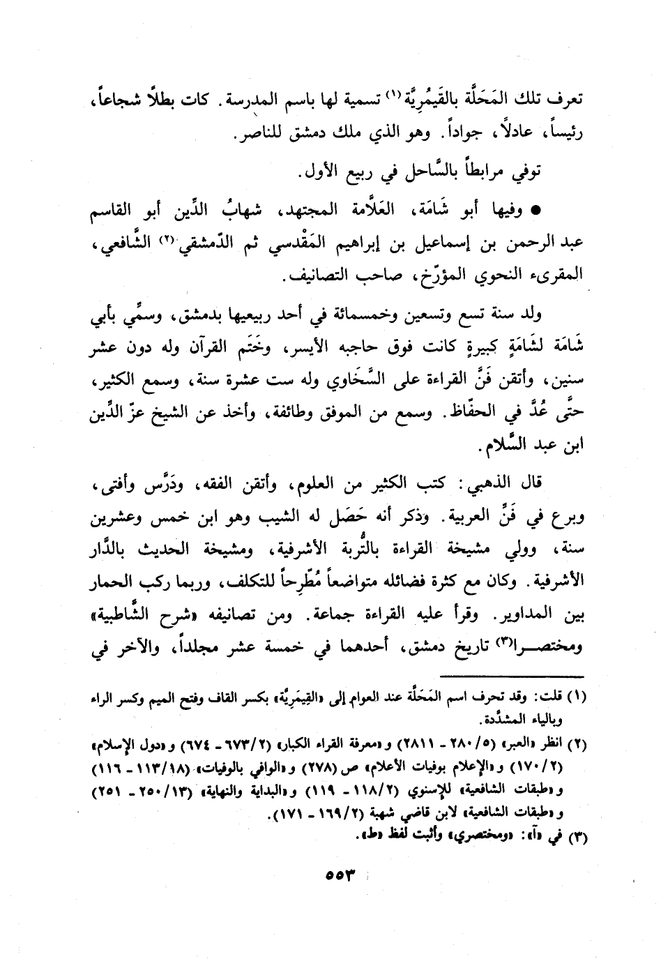 [1] قلت: وقد تحرف اسم المحلّة عند العوام إلى «القيمريّة» بكسر القاف وفتح الميم وكسر الراء وبالياء المشدّدة.